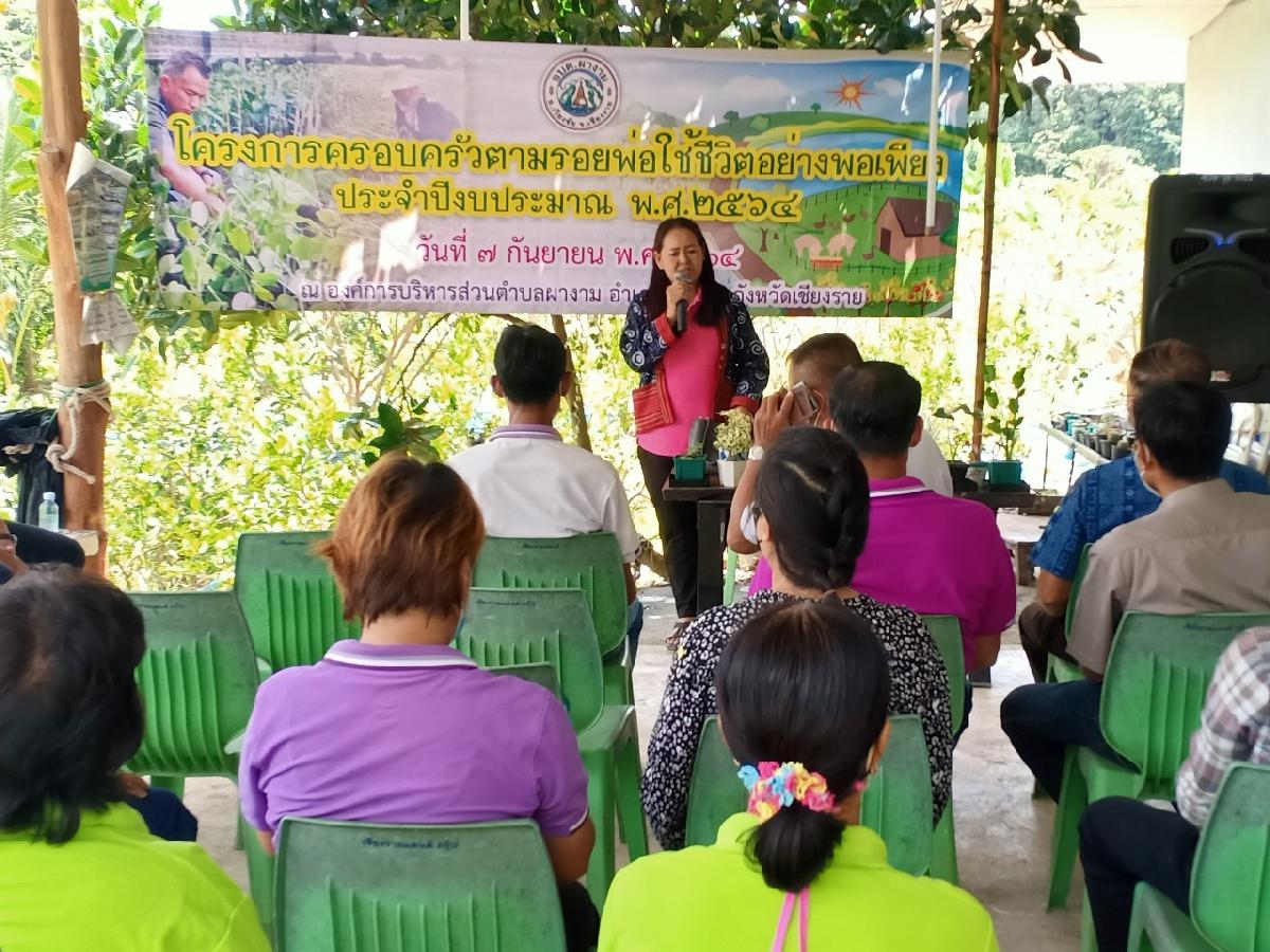 วันที่ 7 กันยายน 2564 เวลา 09.00 น. นายประสิทธิ์ ศิริคำฟู นายกองค์การบริหารส่วนตำบลผางาม มอบหมายให้ สำนักปลัด งานพัฒนาชุมชน จัดทำโครงการครอบครัวตามรอยพ่อใช้ชีวิตอย่างพอเพียง ประจำปีงบประมาณ พ.ศ.2564 วัตถุประสงค์ของโครงการ เพื่อให้กลุ่มผู้นำและประชาชนในชุมชน ได้เรียนรู้วิถีพอเพียงและการนำหลักปรัชญาเศรษฐกิจพอเพียงมาใช้เป็นแนวทางในการประกอบอาชีพ กลุ่มเป้าหมาย ผู้นำชุมชน ประชาชนทั่วไป จำนวน 50 คน และในการจัดกิจกรรมในครั้งนี้ได้ดำเนินการ ตามมาตรการและคำสั่งคณะกรรมการโรคติดต่อจังหวัดเชียงราย เรื่อง การกำหนดมาตรการป้องกันการแพร่ระบาดของโรคติดเชื้อโควิด-19 ในการจัดกิจกรรมซึ่งมีการรวมกลุ่มกัน