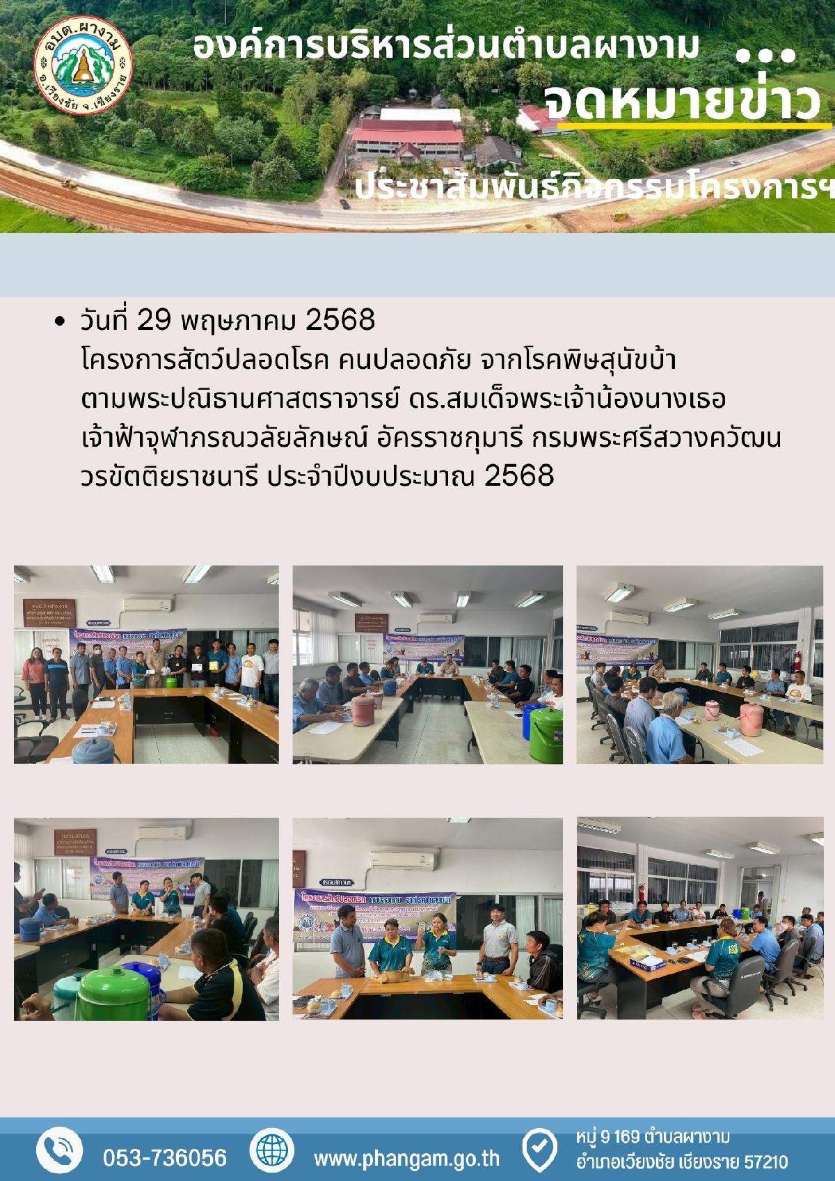 นายพลายงาม พันชั่ง รองนายกองค์การบริหารส่วนตำบล รักษาราชการแทนนายกองค์การบริหารส่วนตำบลผางาม มอบหมายให้ สำนักปลัด งานสาธารณสุข จัดทำโครงการสัตว์ปลอดโรค คนปลอดภัย จากโรคพิษสุนัขบ้า ตามพระปณิธานศาสตราจารย์ ดร.สมเด็จพระเจ้าน้องนางเธอ เจ้าฟ้าจุฬาภรณวลัยลักษณ์ อัครราชกุมารี กรมพระศรีสวางควัฒนวรขัตติยราชนารี ประจำปีงบประมาณ 2568 วัตถุประสงค์ของโครงการเพื่อควบคุมและป้องกันโรคพิษสุนัขบ้า ลดอัตราการป่วย ตาย ของสุนัขและแมวจากโรคพิษสุนัขบ้า และทำให้สุนัขและแมวได้รับวัคซีนป้องกันโรคพิษสุนัขบ้าจากองค์กรปกครองส่วนท้องถิ่นครอบคลุมในพื้นที่
