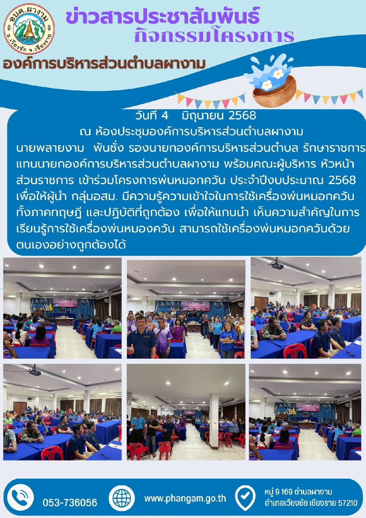 วันที่ 4 มิถุนายน 2568 นายพลายงาม พันชั่ง รองนายกองค์การบริหารส่วนตำบล รักษาราชการแทนนายกองค์การบริหารส่วนตำบลผางาม พร้อมคณะบริหาร หัวหน้าส่วนราชการ เข้าร่วมโครงการพ่นหมอกควัน ประจำปีงบประมาณ 2568 เพื่อให้ผู้นำ มีความรู้ความเข้าใจในการใช้เครื่องพ่นหมอกควัน ทั้งภาคทฤษฎี และปฏิบัติที่ถูกต้อง เพื่อให้แกนนำ เห็นความสำคัญในการเรียนรู้การใช้เครื่องพ่นหมองควัน เพื่อให้แกนนำ สามารถใช้เครื่องพ่นหมอกควันด้วยตนเองอย่างถูกต้องได้