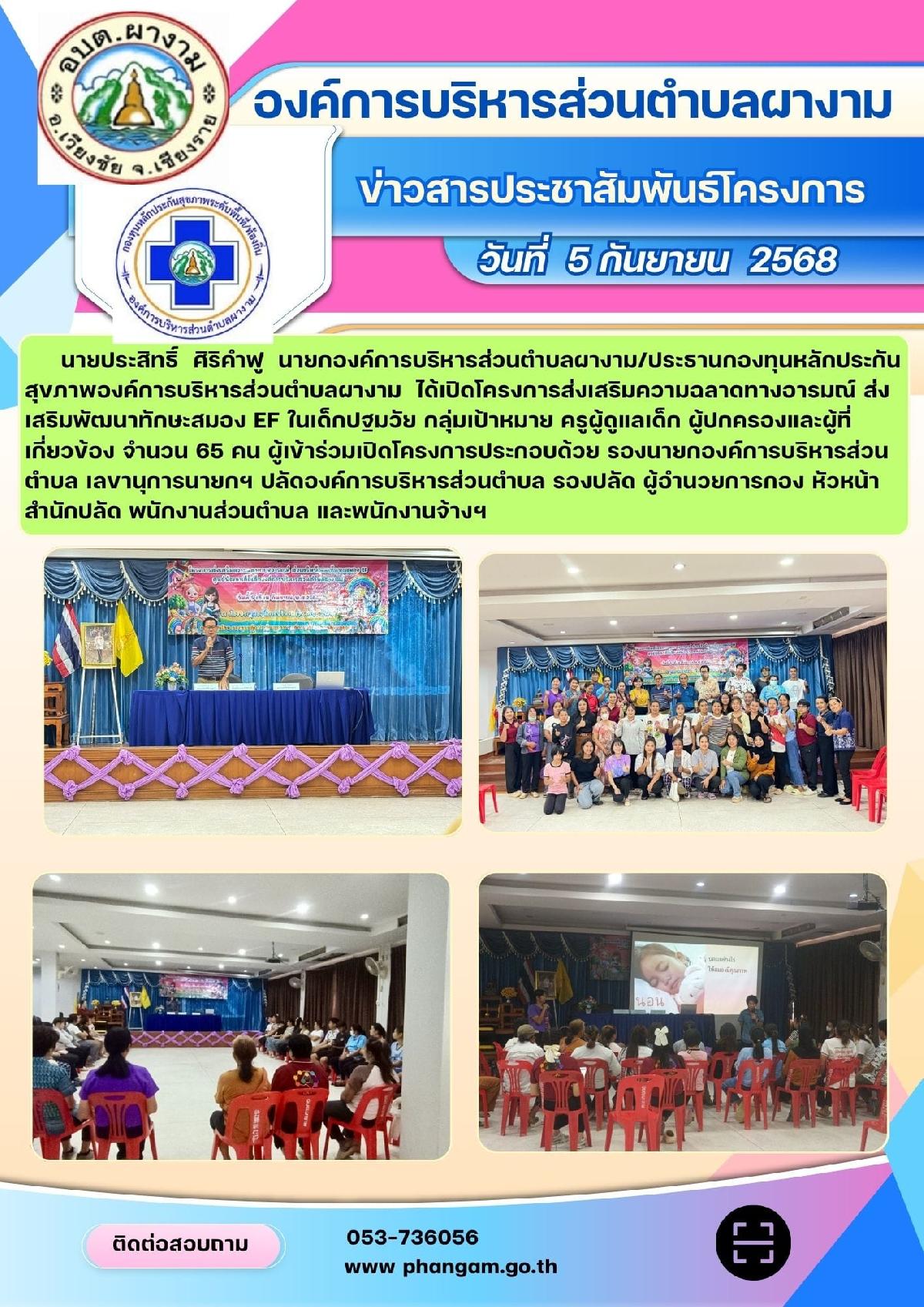 นายประสิทธิ์ ศิริคำฟู นายกองค์การบริหารส่วนตำบลผางาม /ประธานกองทุนหลักประกันสุขภาพองค์การบริหารส่วนตำบลผางาม ได้กล่าวเปิดโครงการส่งเสริมความฉลาดทางอารมณ์ ส่งเสริมพัฒนาทักษะสมอง EF ของศูนย์พัฒนาเด็กเล็กองค์การบริหารส่วนตำบลผางาม 2 โดยมีวัตถุประสงค์เพื่อส่งเสริมและสนับสนุนให้ครูพ่อแม่ผู้ปกครองมีส่วนร่วมในการส่งเสริมพัฒนาการ ความฉลาดทางอารมณ์และทักษะในการส่งเสริมทักษะสมอง (EF) ในเด็กปฐมวัย กลุ่มเป้าหมายครู ผู้เด็กเล็ก ผู้ปกครองและผู้ที่เกี่ยวข้อง จำนวน 65 คน ผู้เข้าร่วมเปิดโครงการประกอบด้วย รองนายกองค์การบริหารส่วนตำบล เลขานุการนายกฯ ปลัดองค์การบริหารส่วนตำบล รองปลัด ผู้อำนวยการกอง หัวหน้าสำนักปลัด และพนักงานส่วนตำบล พนักงานจ้างฯ