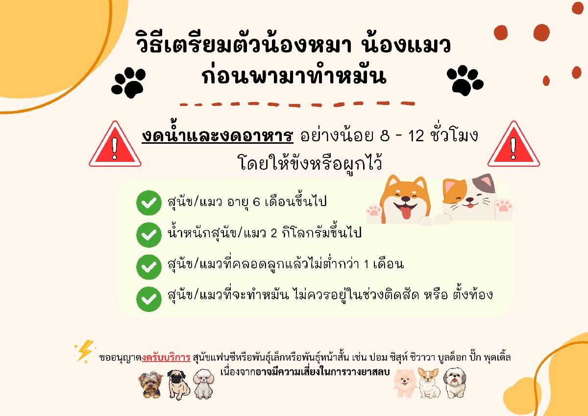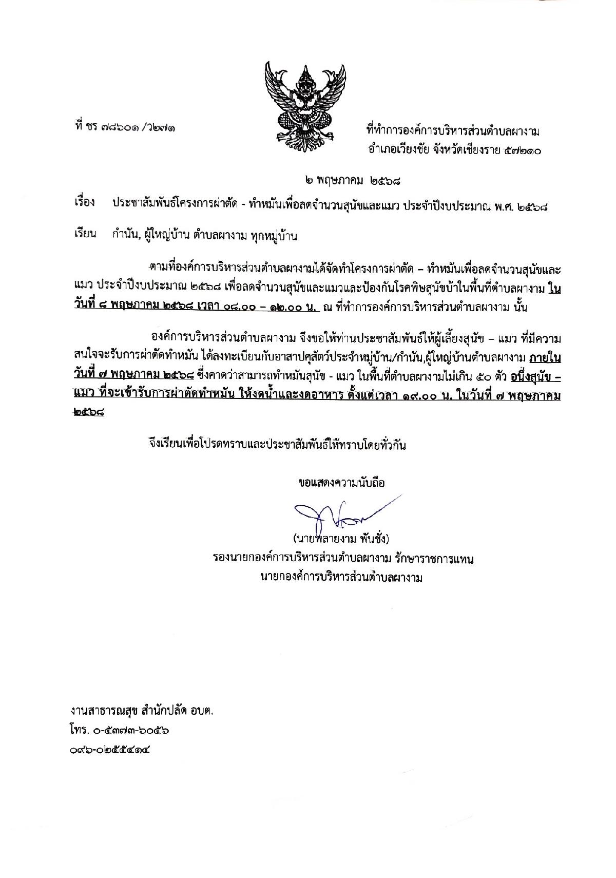 นายพลายงาม พันชั่ง รองนายกองค์การบริหารส่วนตำบล รักษาราชการแทนนายกองค์การบริหารส่วนตำบลผางาม ได้มอบหมายให้ สำนักปลัด งานสาธารณสุข ได้ประชาสัมพันธ์โครงการผ่าตัด - ทำหมันเพื่อลดจำนวนสุนัขและแมว ปีงบประมาณ พ.ศ. 2568 ในวันที่ 8 พฤษภาคม 2568 เวลา 08.00 - 12.00 น. ณ ที่ทำการองค์การบริหารส่วนตำบลผางาม ประชาสัมพันธ์ให้ผู้เลี้ยงสุนัข และ แมว ที่มีความสนใจจะรับการผ่าตัดทำหมัน ได้ลงทะเบียนกับอาสาปศุสัตว์ประจำหมู่บ้าน/กำนัน,ผู้ใหญ่บ้านตำบลผางาม ภายในวันที่ 7 พฤษภาคม 2568 ที่จะเข้ารับการผ่าตัดทำหมัน ให้งดน้ำและงดอาหาร ตั้งแต่เวลา 19.00 น. ในวันที่ 7 พฤษภาคม 2568