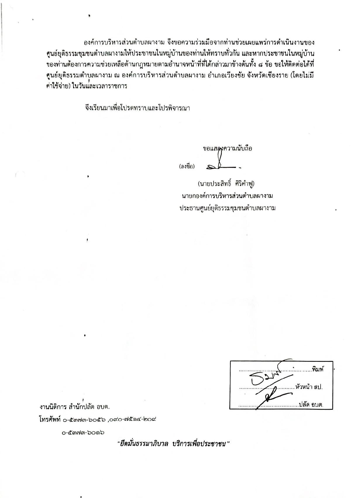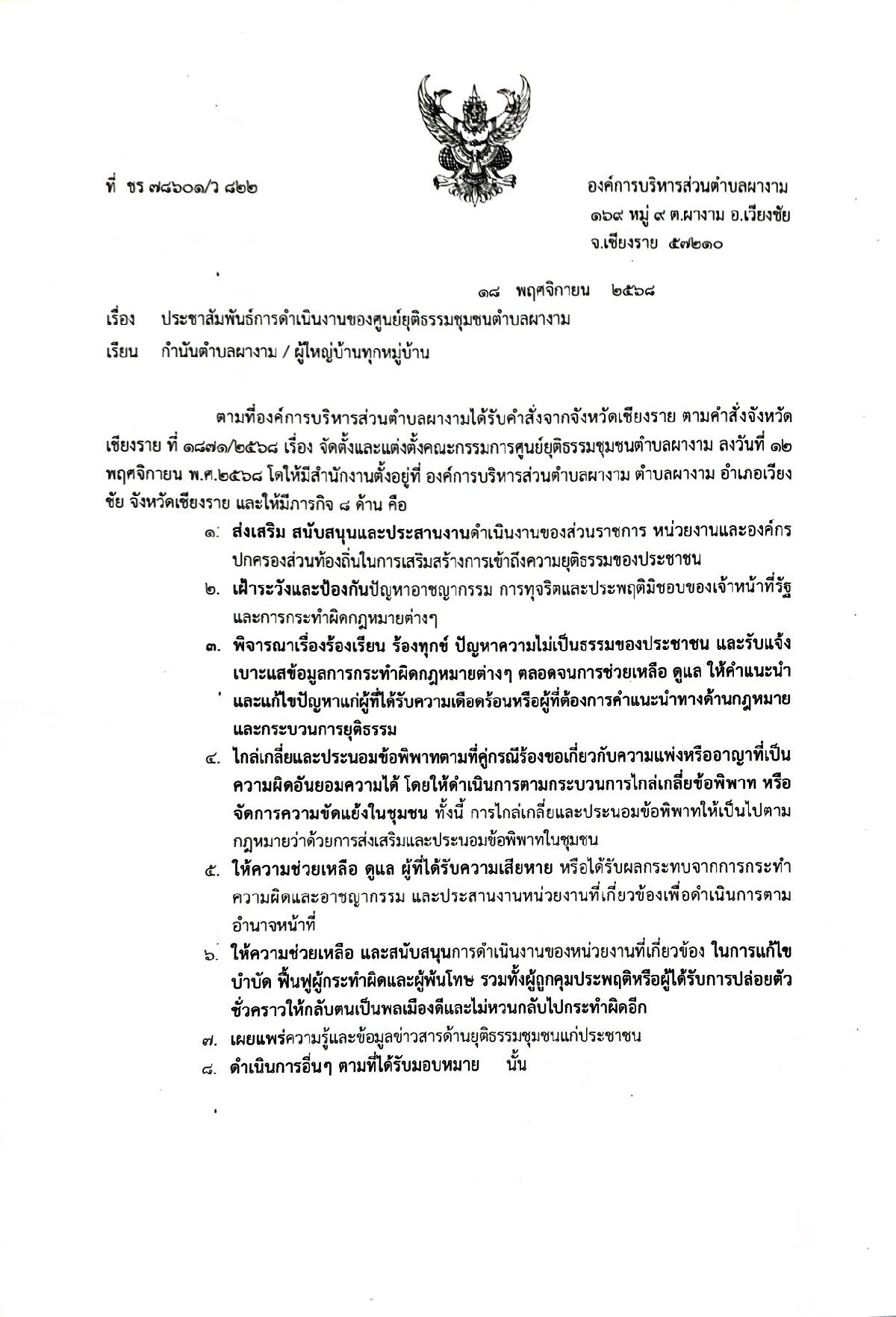 องค์การบริหารส่วนตำบลผางาม โดย นายประสิทธิ์ ศิริคำฟู นายกองค์การบริหารส่วนตำบลผางาม มอบหมายให้ งานนิติการ สำนักปลัด องค์การบริหารส่วนตำบลผางาม ประชาสัมพันธ์การดำเนินงานของศูนย์ยุติธรรมชุมชนตำบลผางาม ตามรายละเอียดที่แนบมาพร้อมนี้